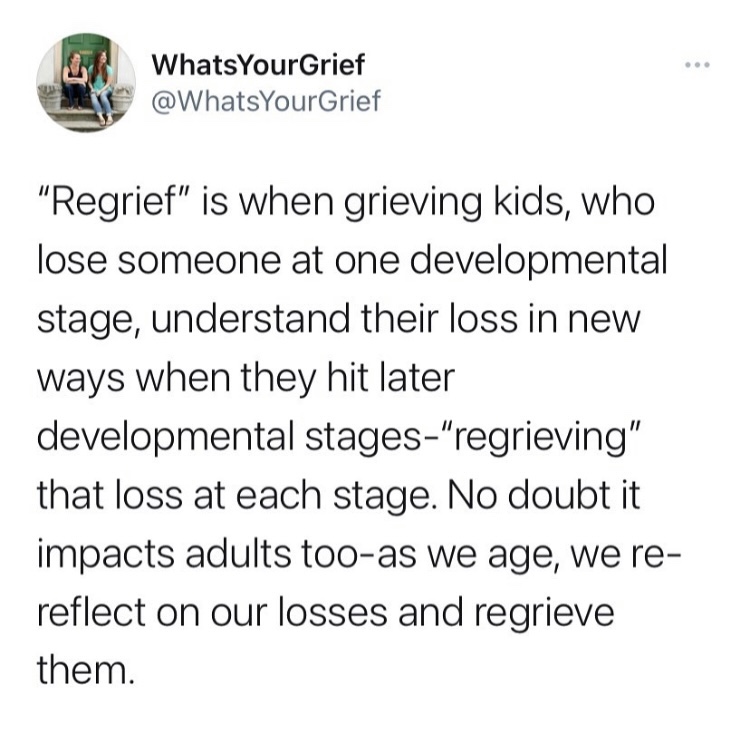 My kids have moments of re-grief too, when they realize what they are missing out on with their grandpa or their brother. As time goes on, and they grow older, they come to realizations that they are missing their person from these moments too.
